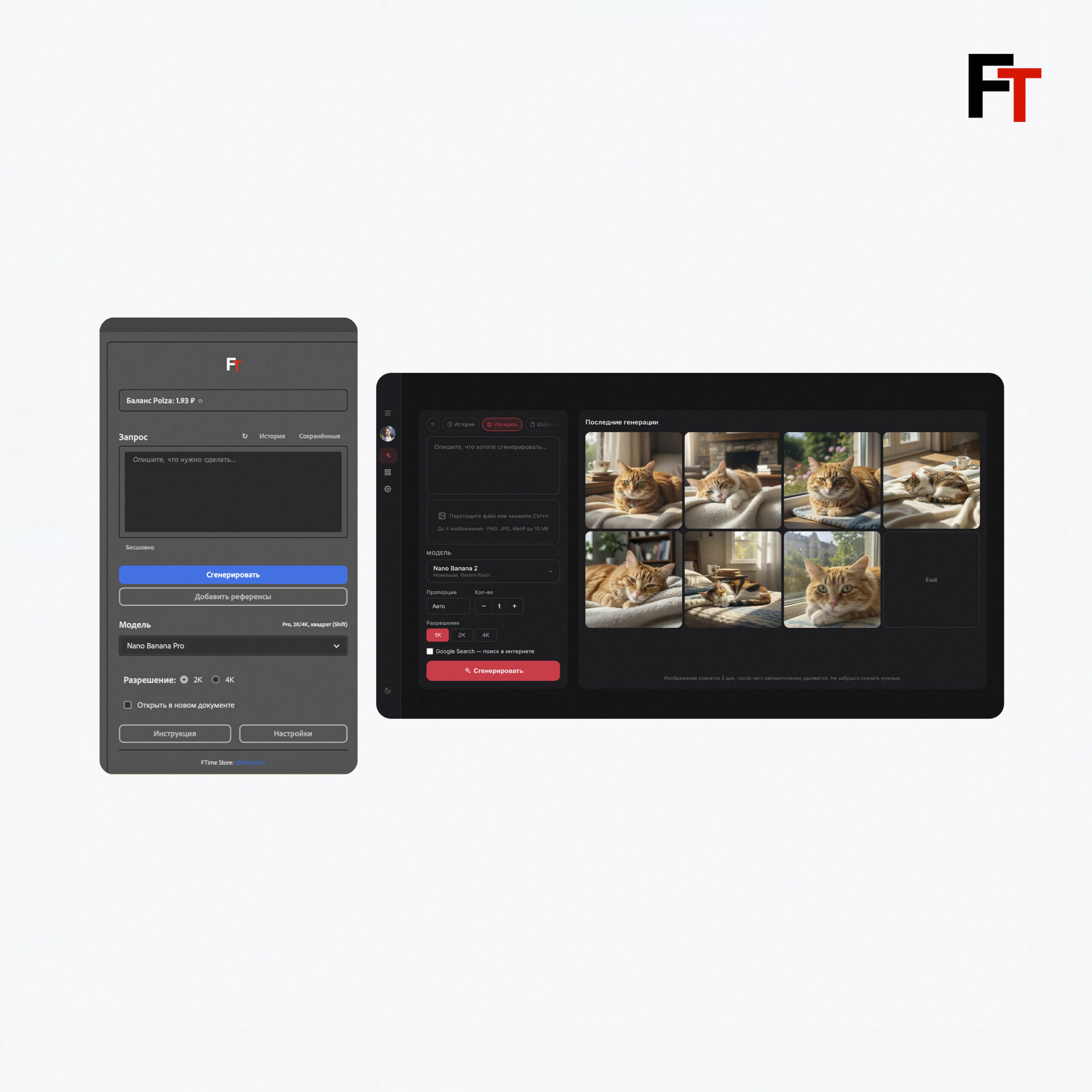 Плагин FTime AI для Adobe Photoshop + веб-генератор app.ftime.org/ai в подарок — два инструмента в одной покупке, работают параллельно на общем балансе.